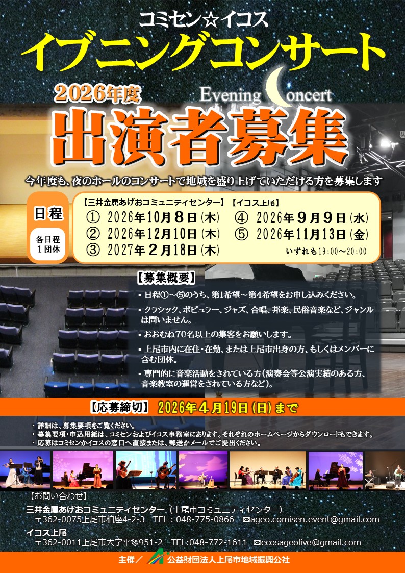 コミセンイブニングコンサート 令和8年度出演者募集します。