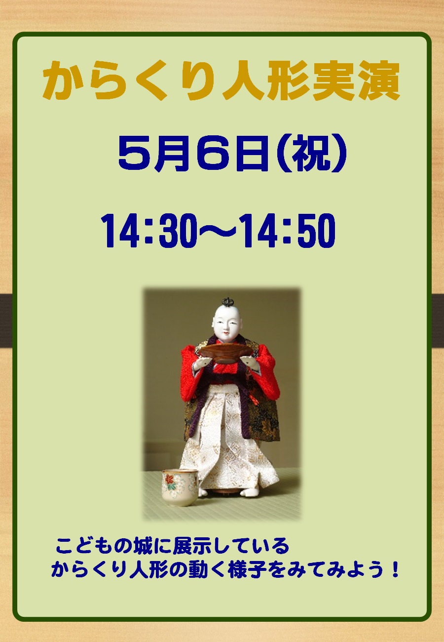 こどもの城に展示しているからくり人形が動いているところをぜひ観にきてね!