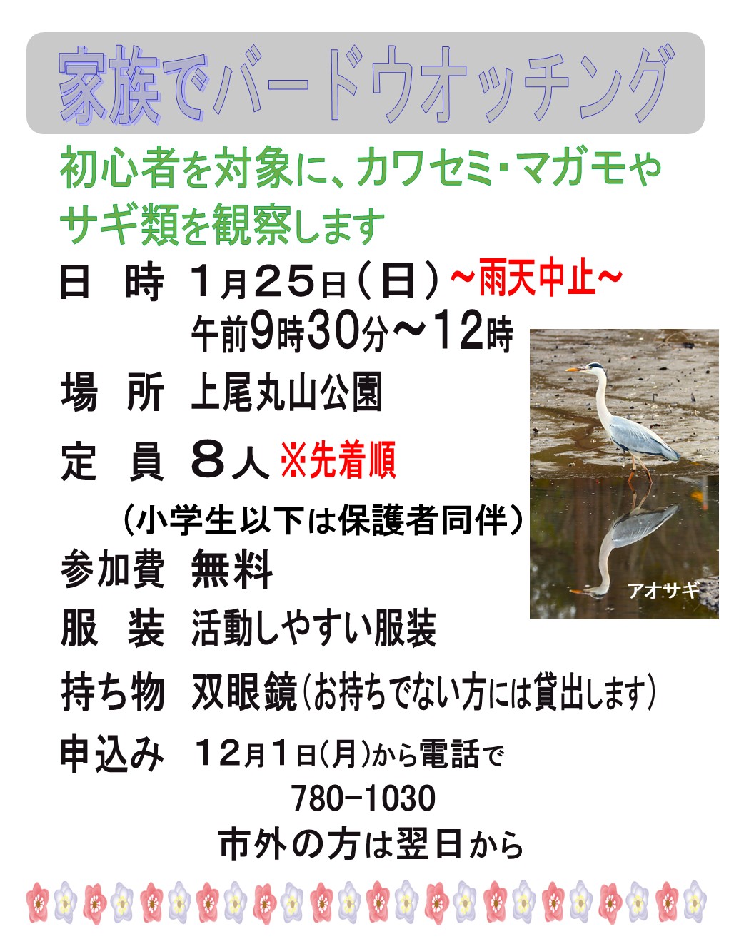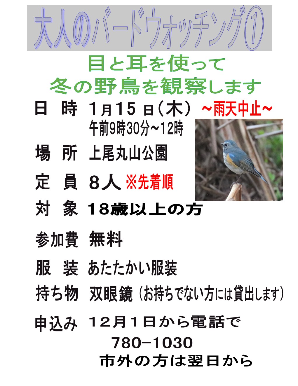 - 出動!野遊び隊 上尾丸山公園の自然を生かしたネイチャーゲームを楽しみます。作って遊ぼう同様20~30分。対象:4,5歳から 保護者同伴