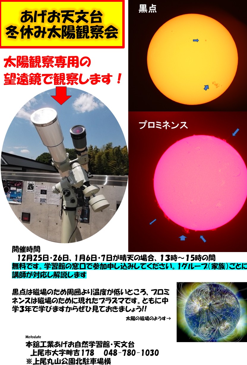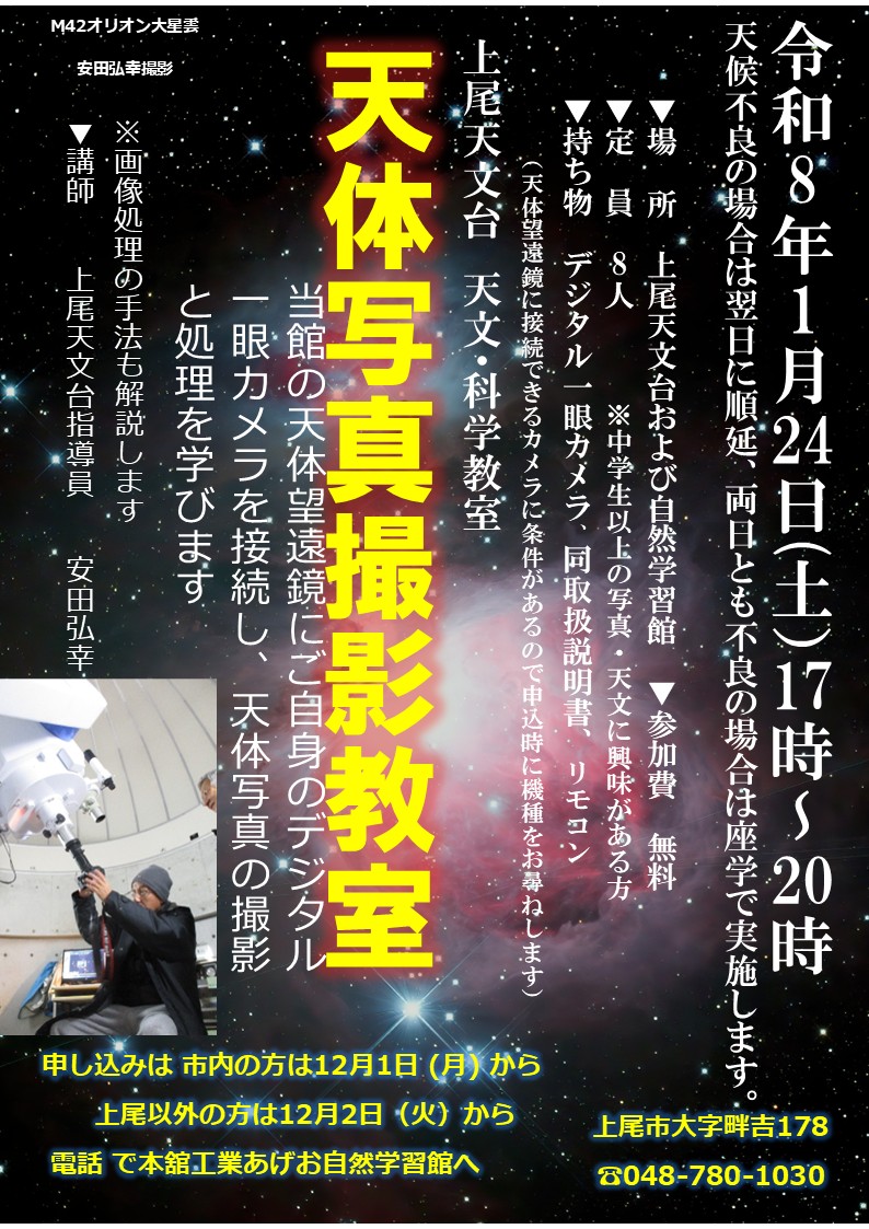 - 土曜日が夜まで晴天予報の場合、13時より学習館窓口またはお電話で予約を受け付けます。日暮れの時刻によっては、開催時間が変わる場合があります。
