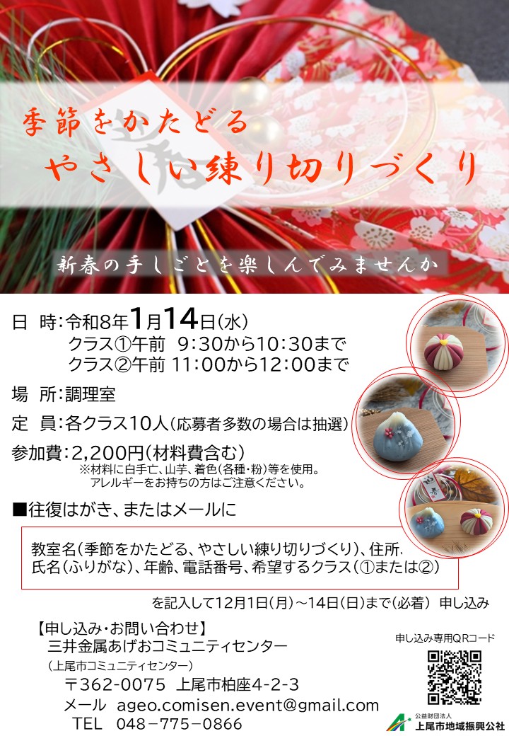 往復はがきまたはメールに教室名(季節をかたどる、やさしい練り切りづくり)、希望するクラス(①・②のいずれか)、住所、氏名(ふりがな)、年齢、電話番号を記入して、12月1日㈪~14日㈰まで(必着)申込み