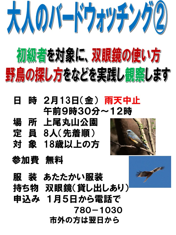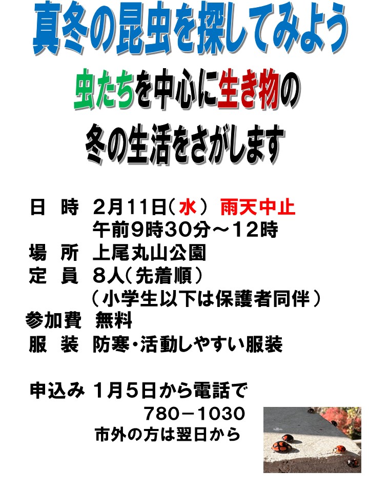- 出動!野遊び隊 上尾丸山公園の自然を生かしたネイチャーゲームを楽しみます。作って遊ぼう同様20~30分。対象:4,5歳から 保護者同伴