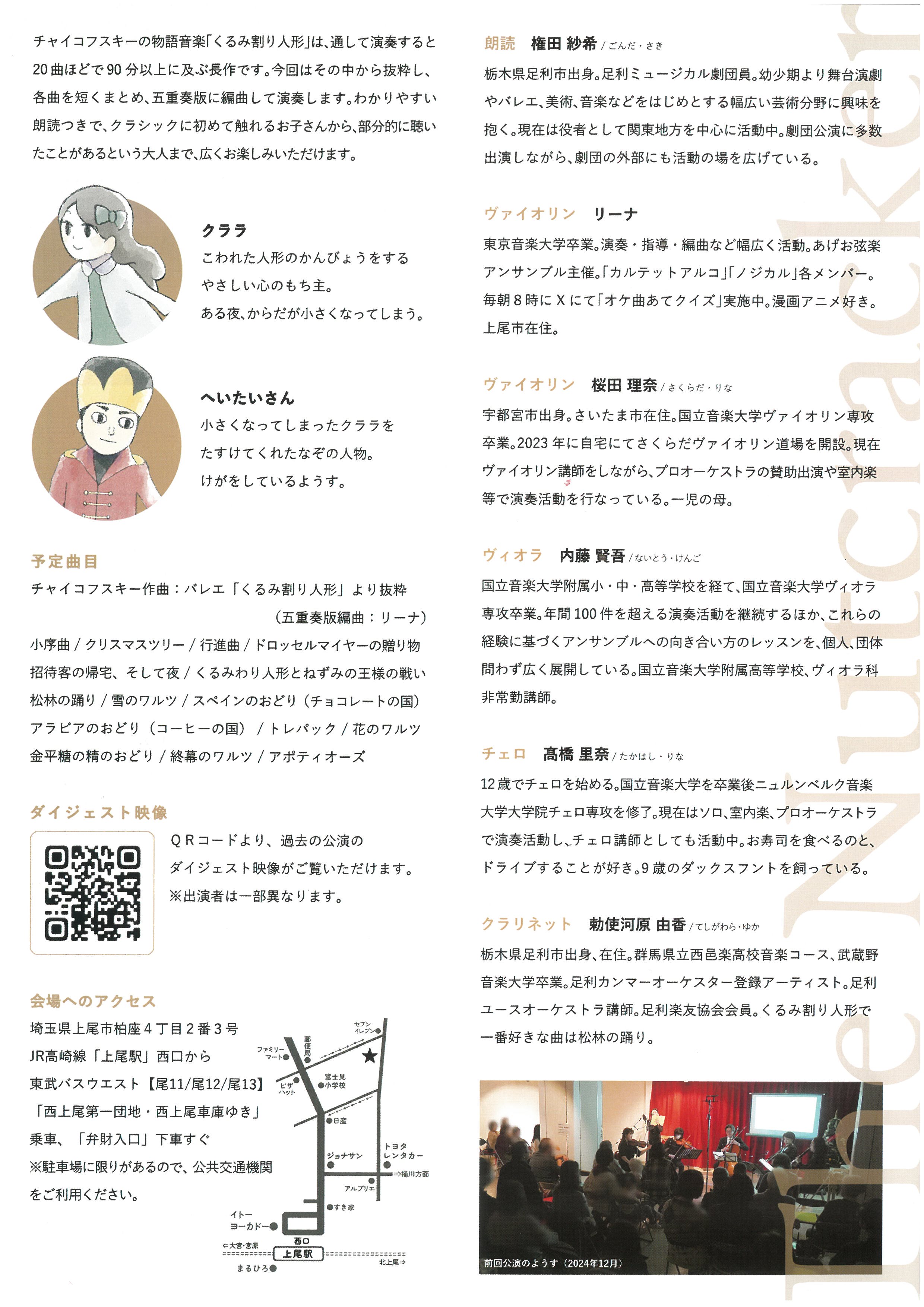 チャイコフスキーの物語音楽「くるみ割り人形」にイラストと朗読を交えながら進行する、子どもから大人まで楽しめるコンサート