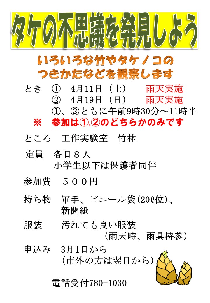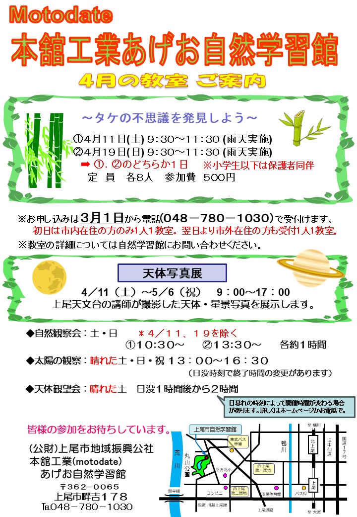 - 出動!野遊び隊 上尾丸山公園の自然を生かしたネイチャーゲームを楽しみます。作って遊ぼう同様20~30分。対象:4,5歳から 保護者同伴