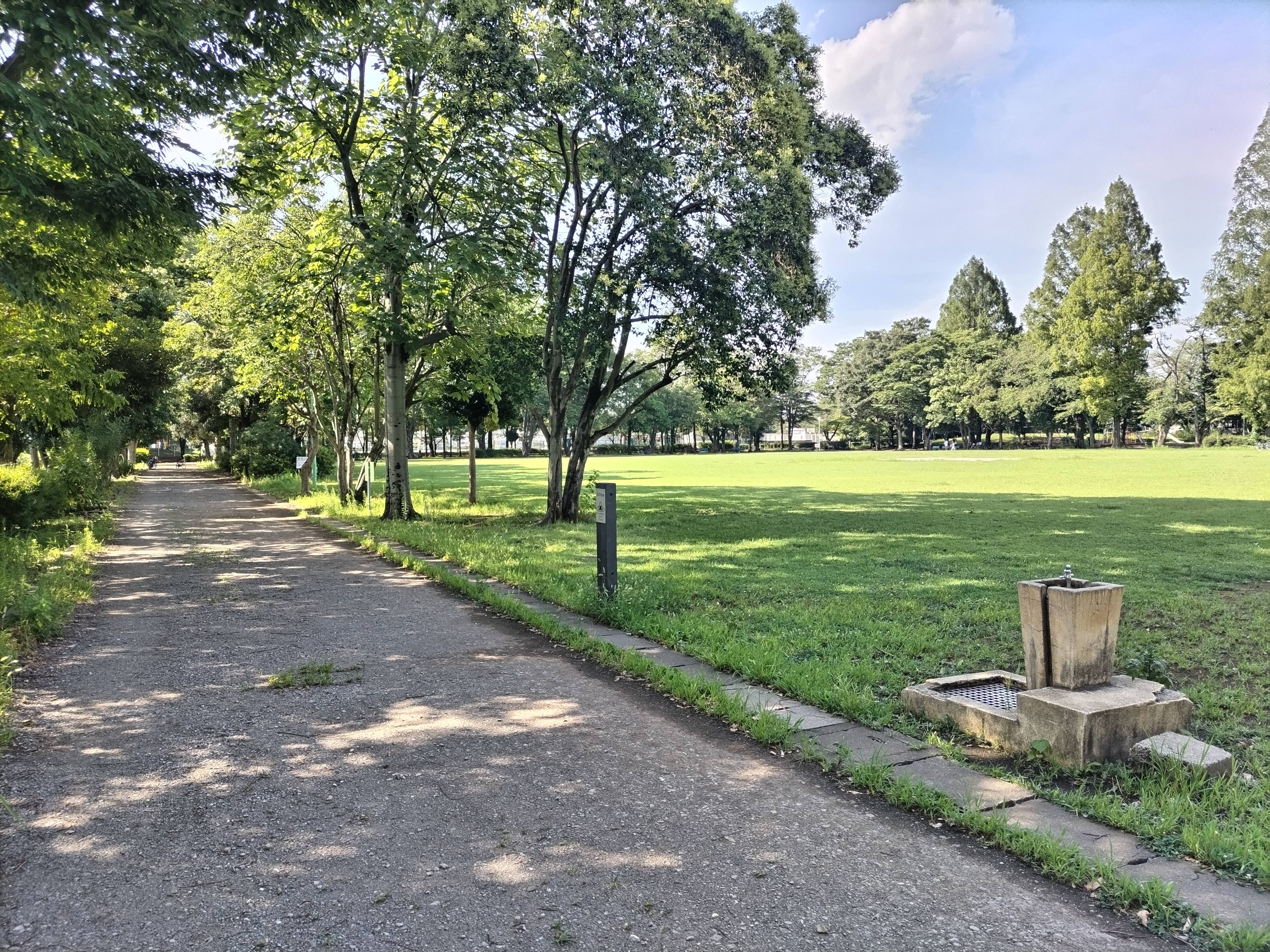 大きな芝生広場、1周約500mの遊歩道、遊具のある広場などがある大きな公園です。