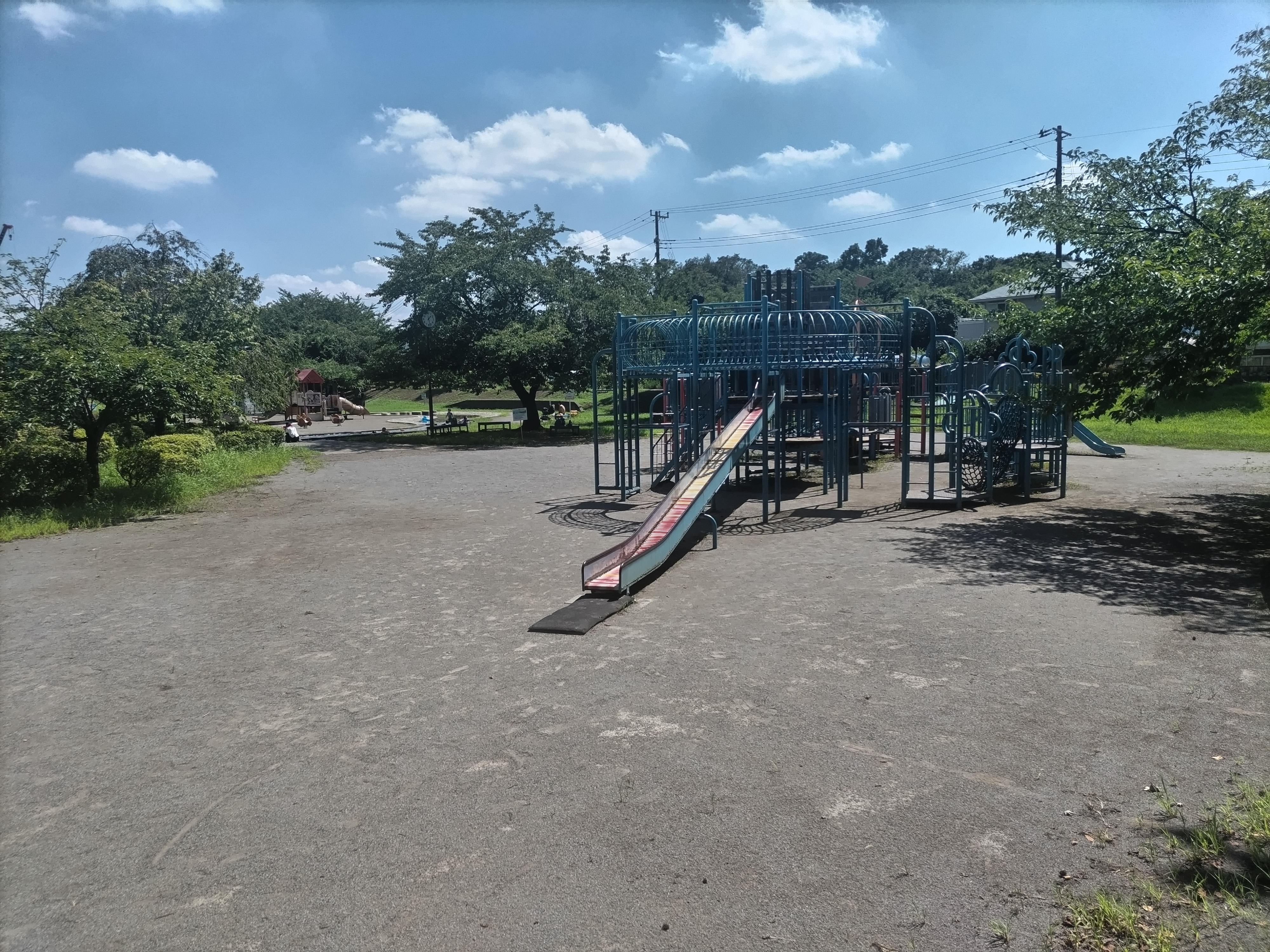 ローラー滑り台のある複合遊具、砂場、スプリング遊具、せせらぎや藤棚があります。