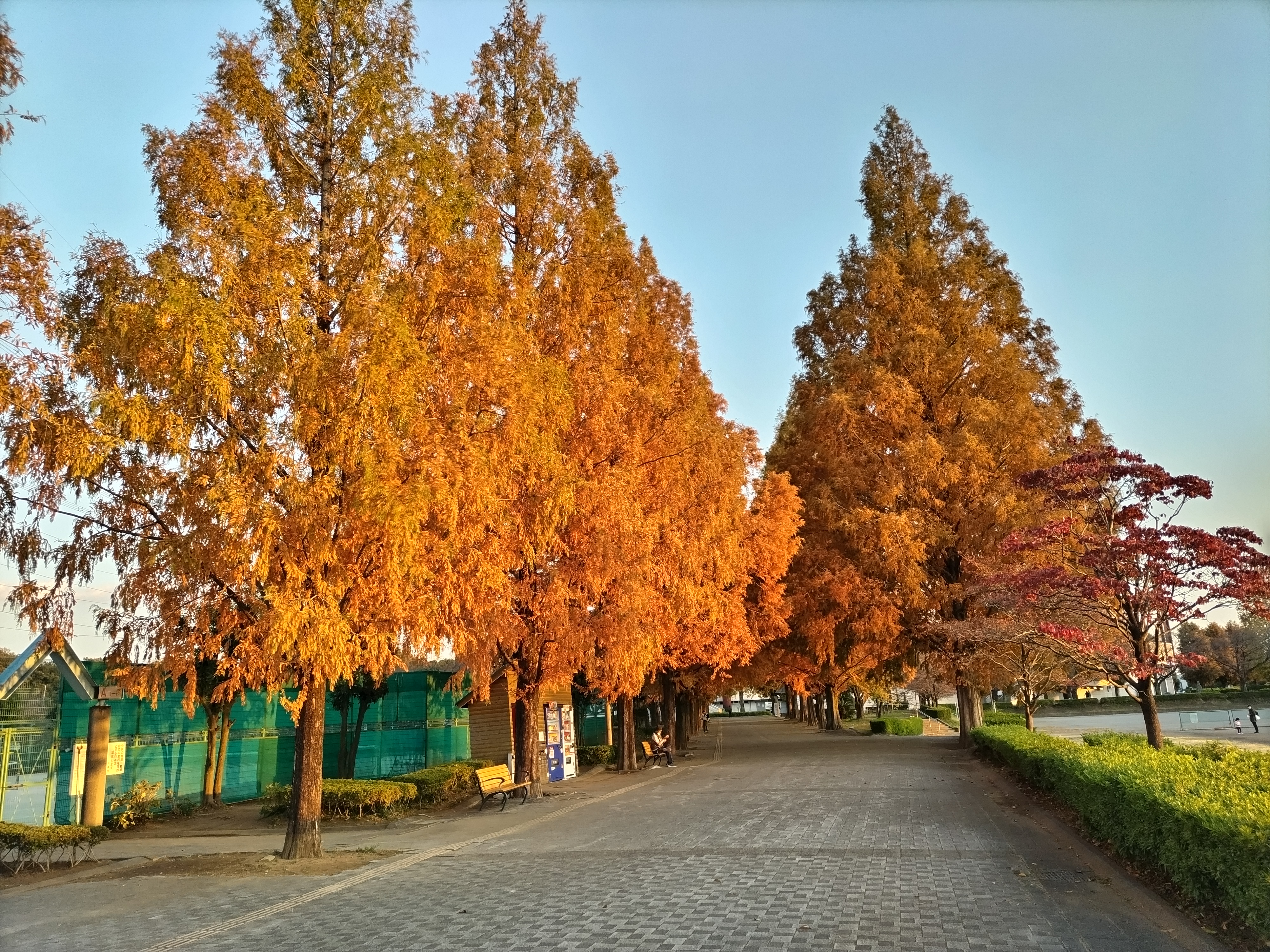 紅葉の季節になると、テニスコートから市民球場にかけての園路に生えているメタセコイアが綺麗に紅葉します。