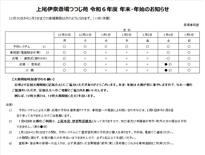 上尾伊奈斎場つつじ苑 令和7年度 年末・年始のお知らせ